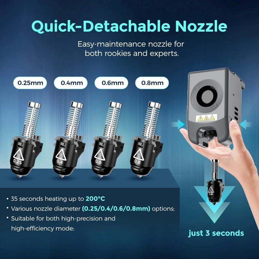 Swap between four nozzle sizes — 0.25mm, 0.4mm, 0.6mm, or 0.8mm — to choose between ultra-fine detail or high-speed efficiency. The quick-detach system lets you change nozzles in seconds — no tools, no mess, no downtime.